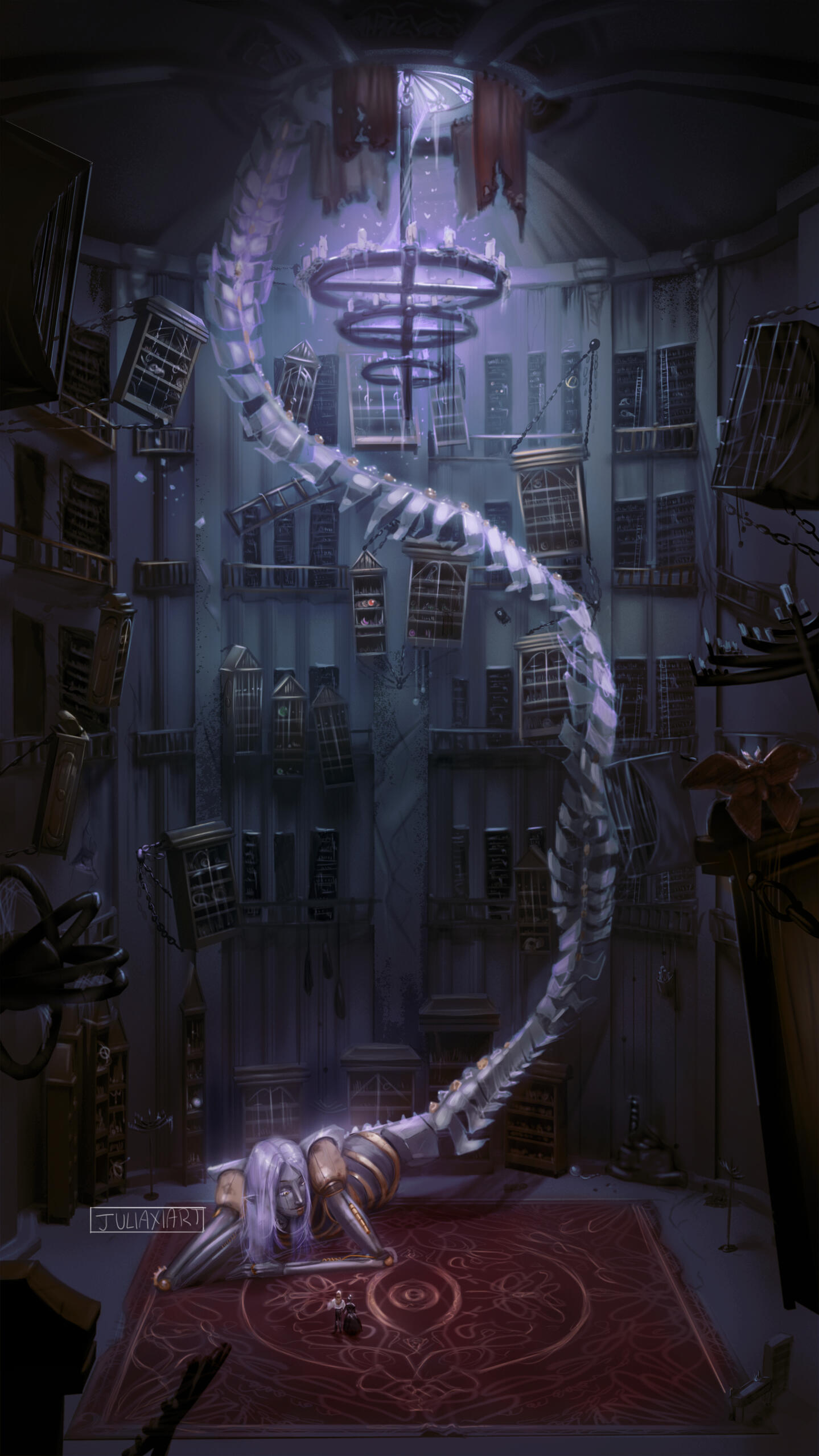 As an exercise in illustrative storytelling and worldbuilding, I challenged myself with a highly detailed illustration. Although certain aspects like the intricacies of the robotic parts of the Librarian wouldn't be shown in the illustration, I placed this work within an imagined context of being a concept piece that would later be used in either a game or film.